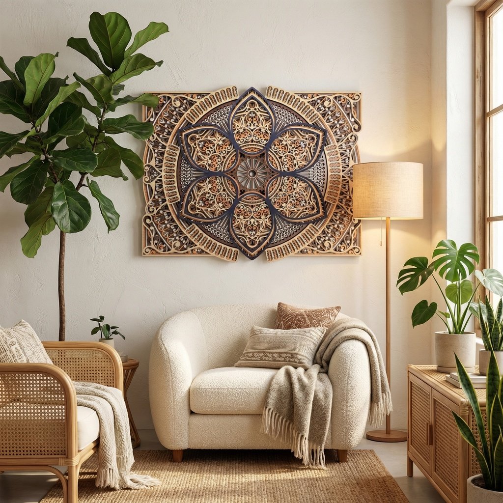 Deze mandala is ontworpen om een onvergetelijke indruk achter te laten. Het meerlaagse design, gecombineerd met subtiele kleurenschema’s, maakt deze muurdecoratie geschikt voor diverse stijlen, van modern tot boho en van minimalistisch tot eclectisch. Plaats het in de woonkamer, slaapkamer, of zelfs in een kantoorruimte om de sfeer te transformeren en tegelijkertijd een rustgevend effect toe te voegen.