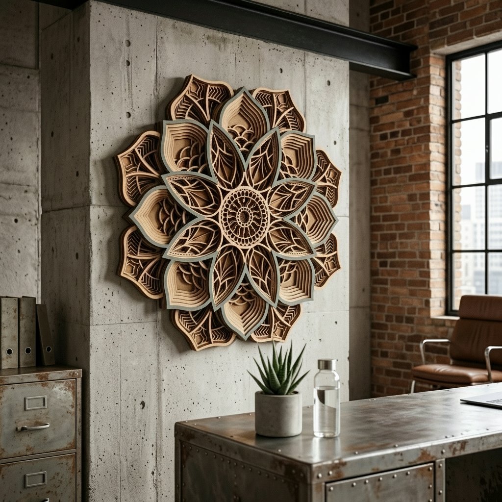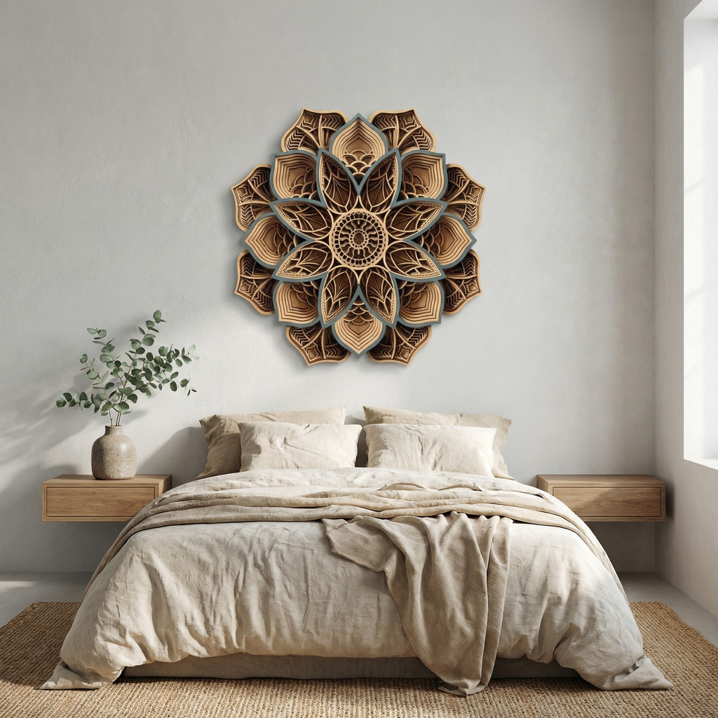 Met zijn 8 hoogwaardige houten lagen combineert deze mandala-decoratie diepte, textuur en indrukwekkende precisie. Elk detail is nauwkeurig met een laser uitgesneden en met de hand samengevoegd tot een driedimensionaal ontwerp. De zachte schaduwen die ontstaan, zorgen voor een dynamisch visueel effect, dag in dag uit.