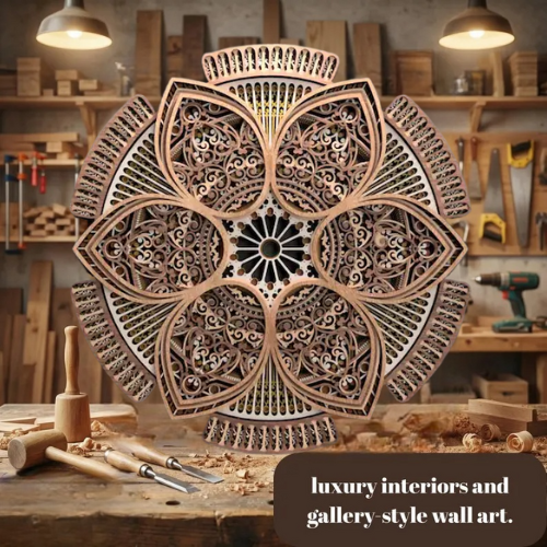 Bij Hemelse Bloei draait alles om detail en perfectie. Elk patroon van de mandala is zorgvuldig uitgesneden, waarbij afgeronde lijnen en sierlijke krullen een harmonieuze dans van vormen creëren. Dit maakt het niet zomaar een decoratiestuk, maar een echt artistiek statement waarmee je jouw unieke stijl kunt uitdrukken. Of het nu in de woonkamer, slaapkamer of kantoor hangt, het brengt meteen een gevoel van verfijning en vakmanschap met zich mee.