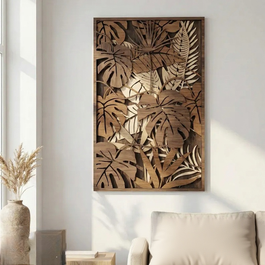 Gelaagde Monstera Muurkunst van Hout – Handgemaakte 3D Wanddecoratie