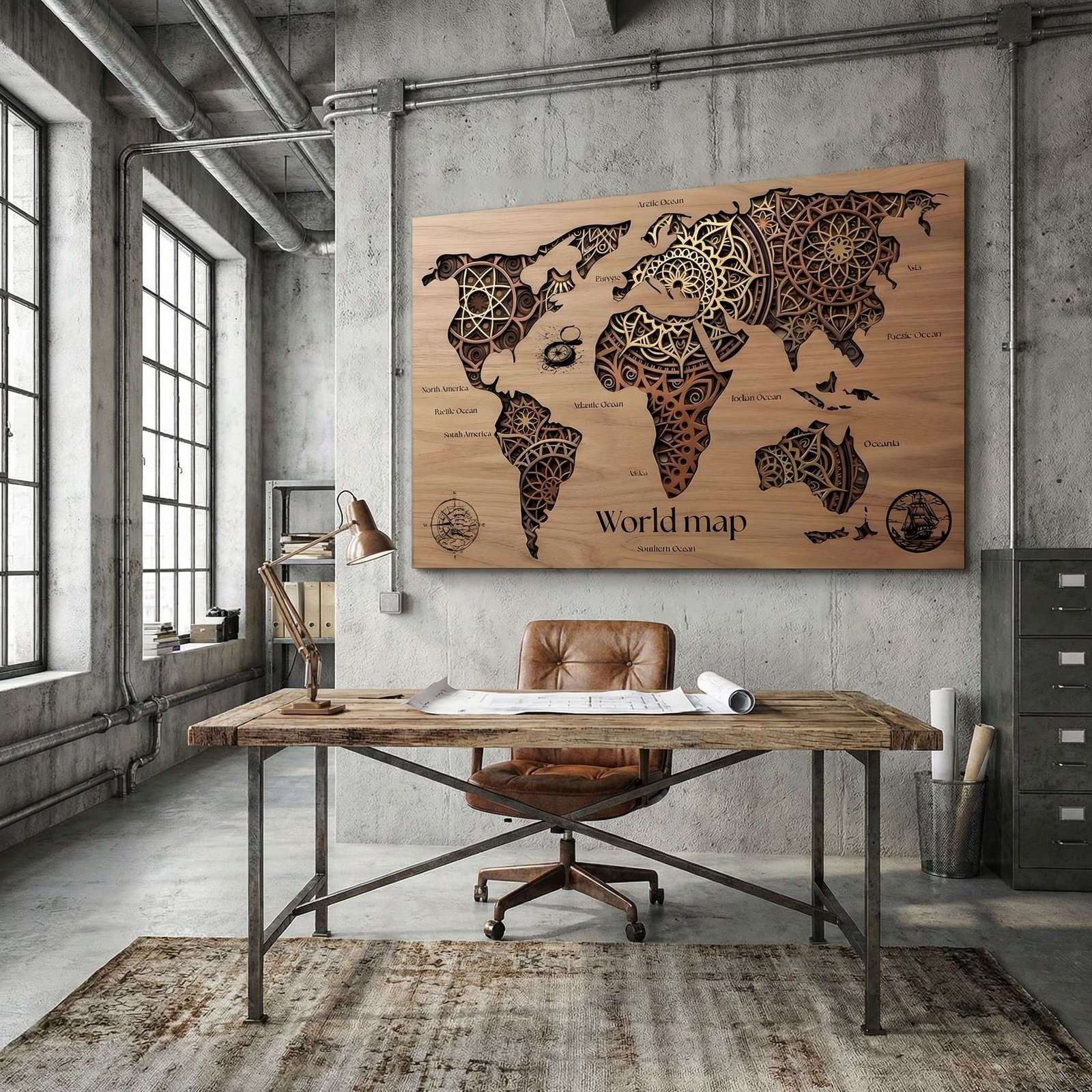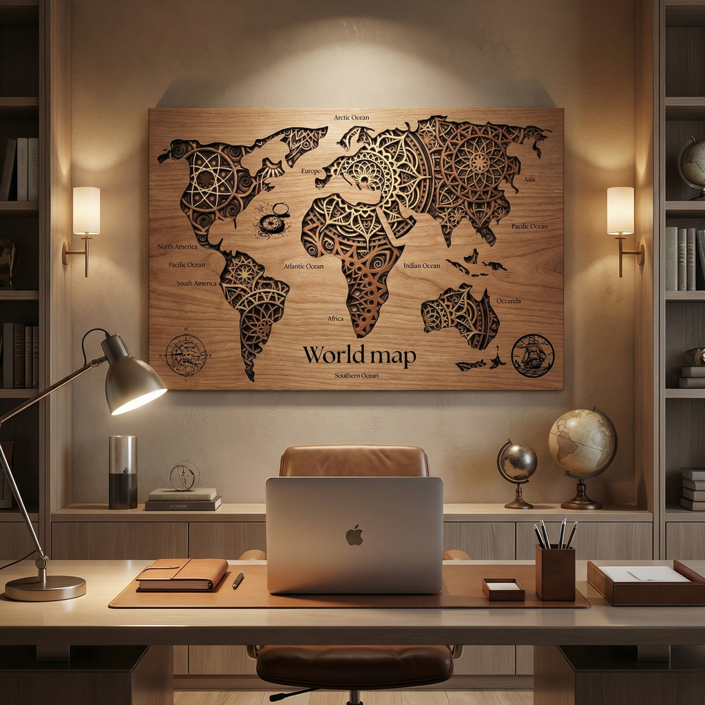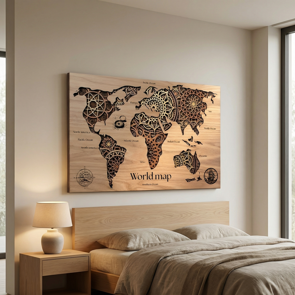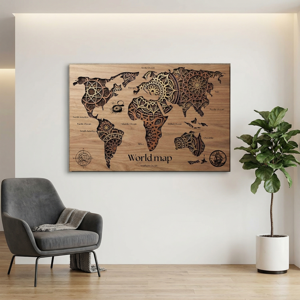 Het spel van licht en schaduw geeft deze 3D houten wereldkaart een levendige, luxe uitstraling. Of het nu boven de bank, het bed of in jouw kantoorruimte hangt, het zal gegarandeerd de aandacht trekken en een statement maken.