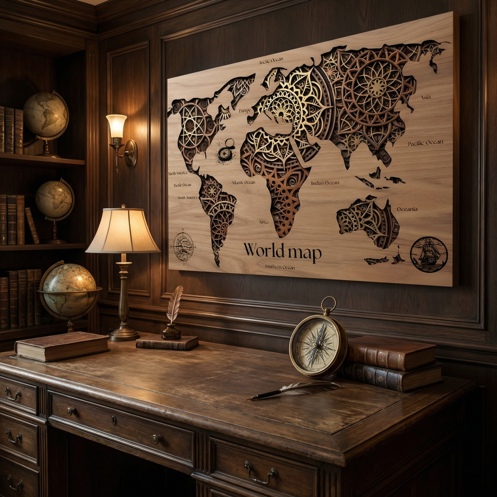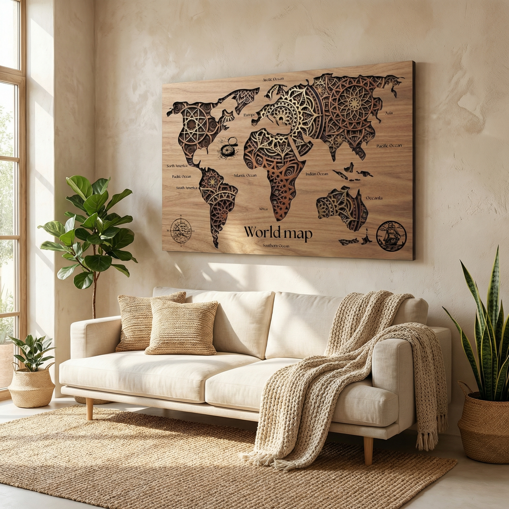 Gemaakt uit 8 lagen hoogwaardig hout die met precisie lasergesneden zijn, biedt de Terra Mandala een indrukwekkend diepte-effect. Elke laag is zorgvuldig geplaatst om een harmonieus visueel feest te creëren dat perfect past in moderne en klassieke interieurstijlen.