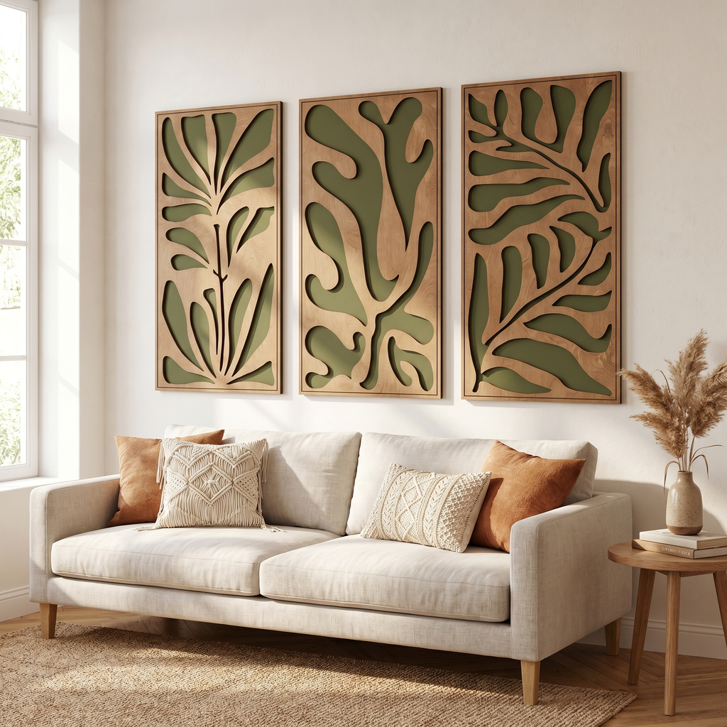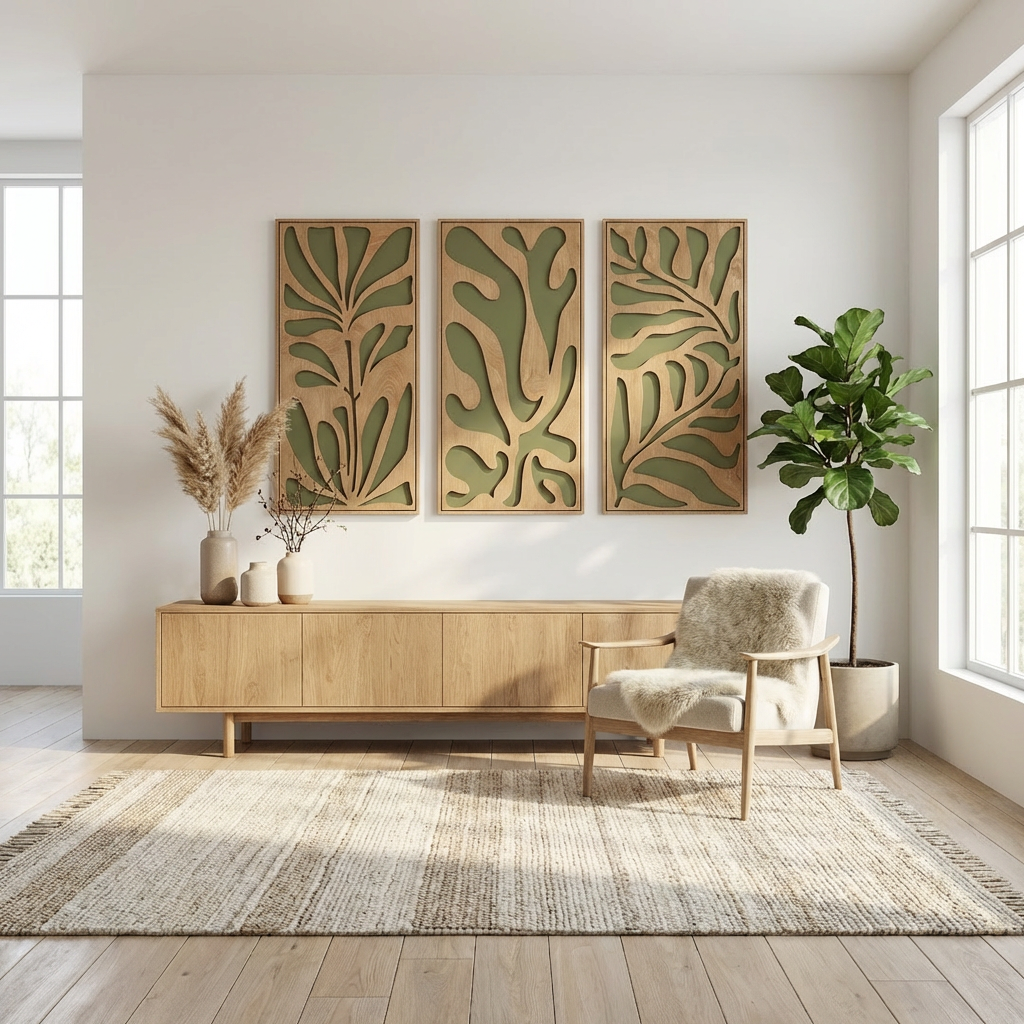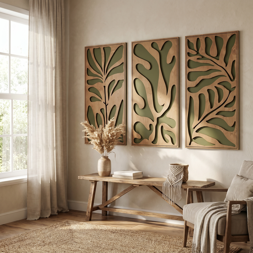 Transformeer je woonruimte met de verfijnde schoonheid van de Tropical Breeze Trio wanddecoratie. Met zijn subtiele combinatie van olijfgroene tinten en een natuurlijke houtafwerking brengt dit driedelige kunstwerk (triptych) een vleugje verfijnde tropische sfeer in elke kamer.