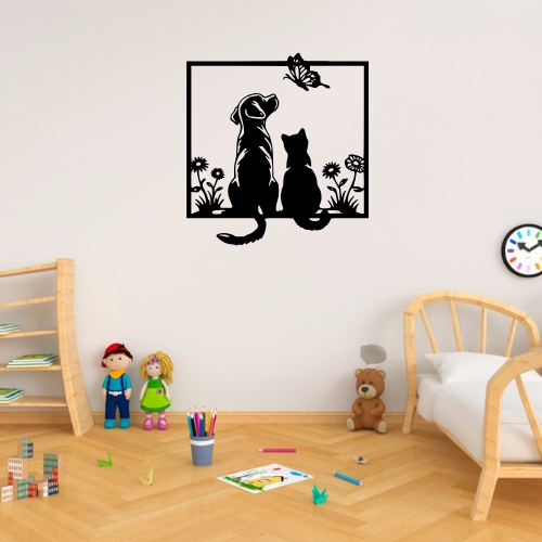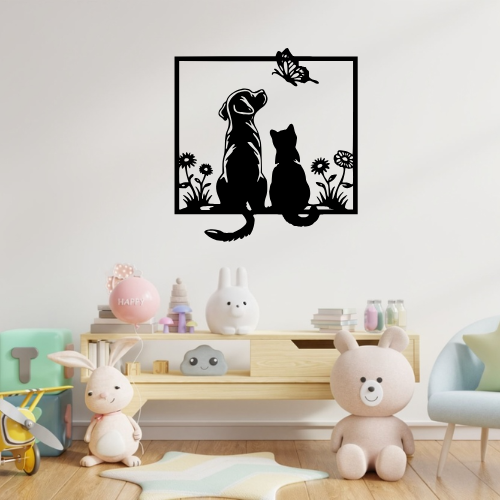 Geef jouw interieur een liefdevolle uitstraling met deze schattige Wagging Tales Wall  muurkunst! Het silhouetontwerp van een hond en kat die samen in een bloementuin zitten en naar een vlinder kijken, brengt direct warmte en charme in elke ruimte.
