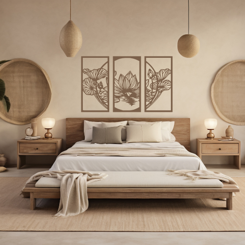 Breng rust en harmonie in je interieur met deze exclusieve Lotusvijver houten wandpaneel set van 3. De verfijnde waterlelie-illustratie is nauwkeurig laser gesneden uit hoogwaardig hout, waardoor elk paneel een strak en gedetailleerd lijnenspel krijgt.